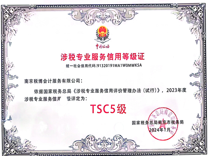国家税务总局南京市税务局认证的涉税专业信用服务等级TSC5级(最高等级)